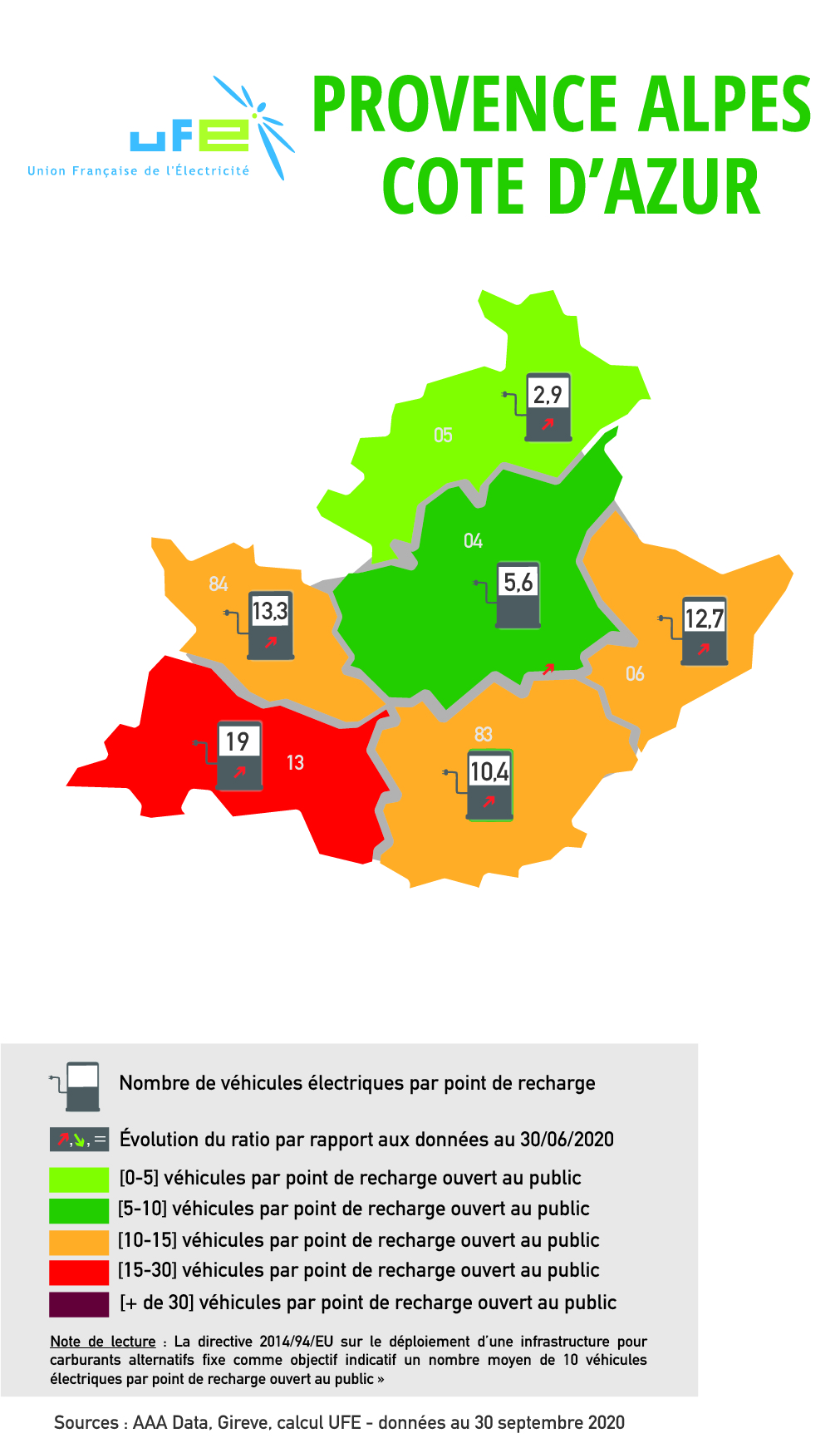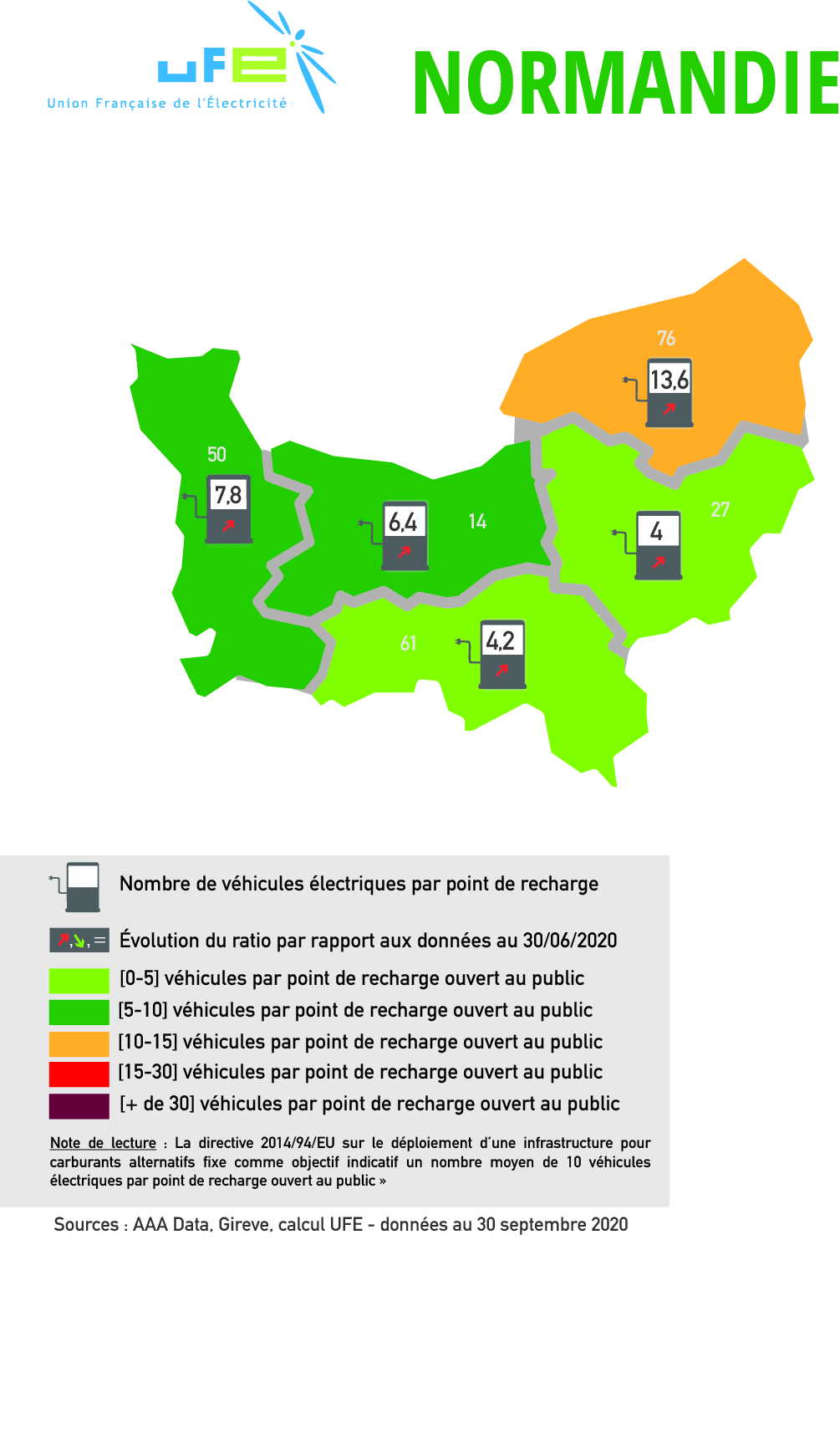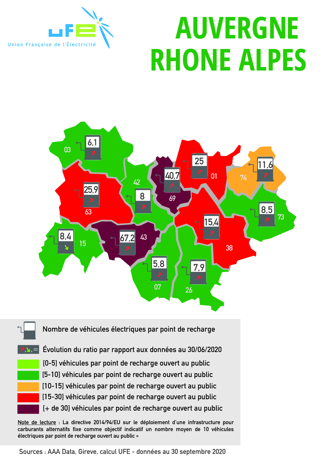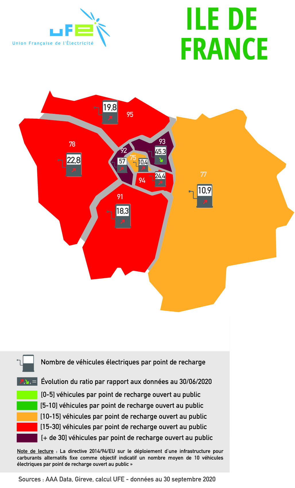 Cette nouvelle édition[[Source : AAA Data et GIREVE pour l’UFE au 30 septembre 2020. Attention, le nombre de points de recharge peut connaitre une baisse significative dans certaines zones géographiques liée à une mise à jour effectuée par GIREVE dans la base de données en octobre dernier.]] présente également l’évolution de ce ratio par rapport à sa valeur de septembre dernier. Si un territoire affiche une flèche rouge vers le haut, le ratio a augmenté ce qui traduit une dégradation de la situation, l’installation de nouveaux points de recharge ayant été moins rapide que le développement de l’électromobilité. A l’inverse, la flèche verte vers le bas montre que le territoire a augmenté son offre en termes d’IRVE ou que les ventes de véhicules électriques n’ont pas connu un rythme de développement équivalent durant cette période.