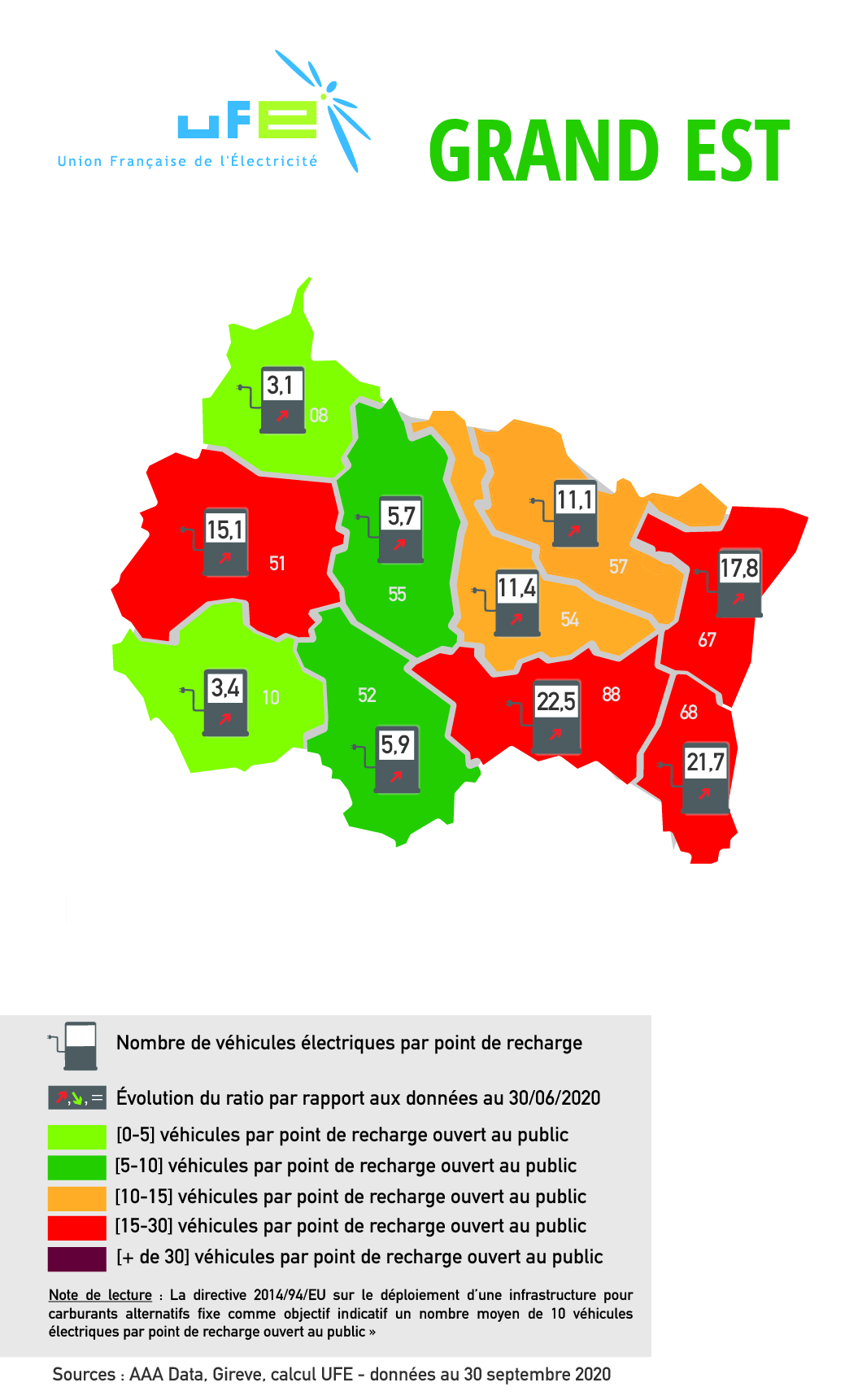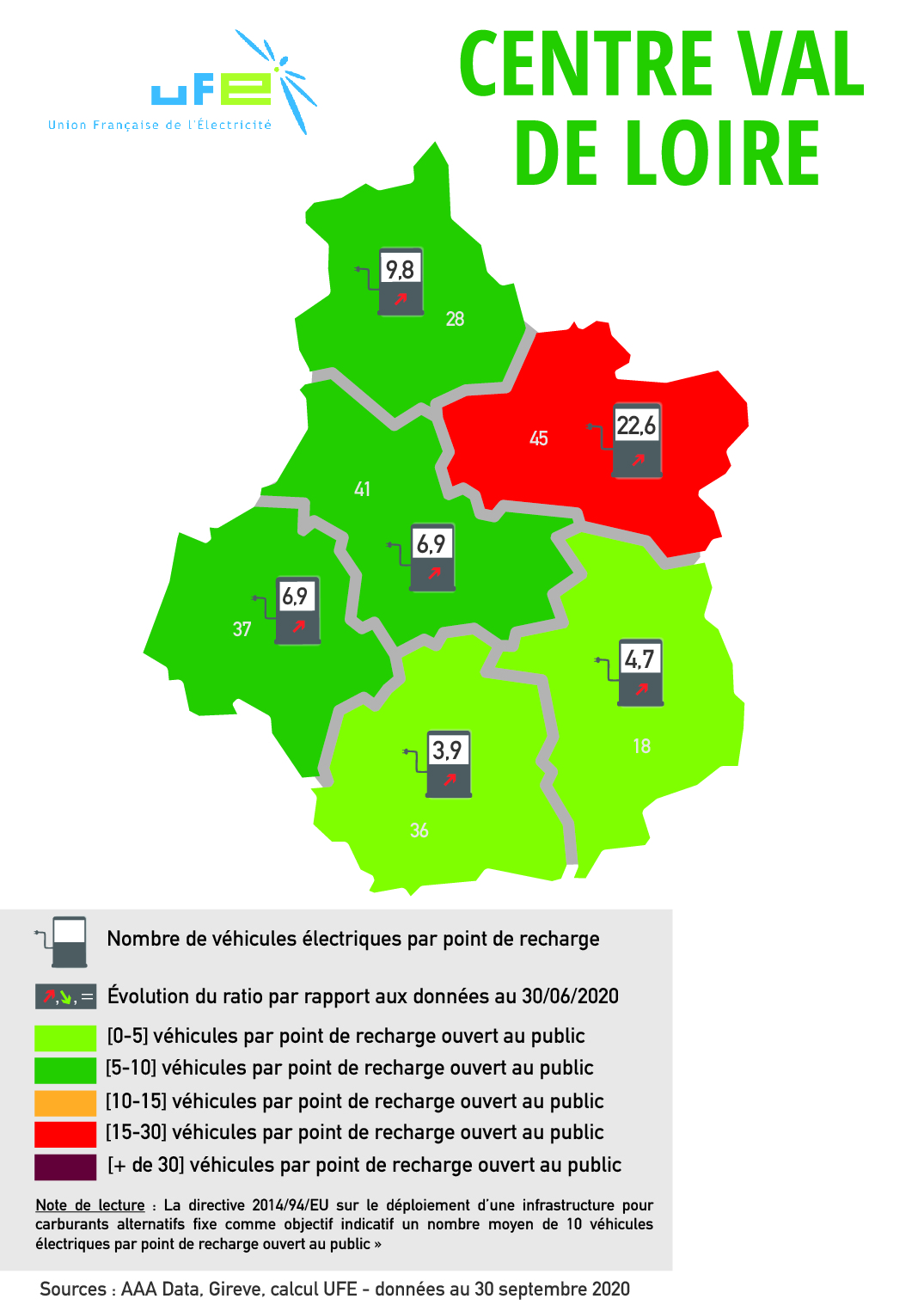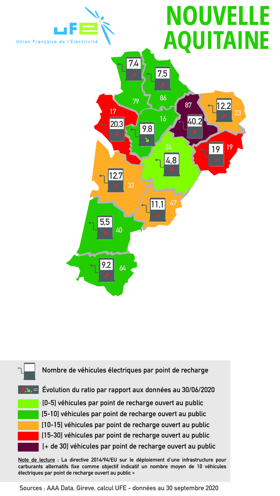 Cette nouvelle édition[[Source : AAA Data et GIREVE pour l’UFE au 30 septembre 2020. Attention, le nombre de points de recharge peut connaitre une baisse significative dans certaines zones géographiques liée à une mise à jour effectuée par GIREVE dans la base de données en octobre dernier.]] présente également l’évolution de ce ratio par rapport à sa valeur de septembre dernier. Si un territoire affiche une flèche rouge vers le haut, le ratio a augmenté ce qui traduit une dégradation de la situation, l’installation de nouveaux points de recharge ayant été moins rapide que le développement de l’électromobilité. A l’inverse, la flèche verte vers le bas montre que le territoire a augmenté son offre en termes d’IRVE ou que les ventes de véhicules électriques n’ont pas connu un rythme de développement équivalent durant cette période.