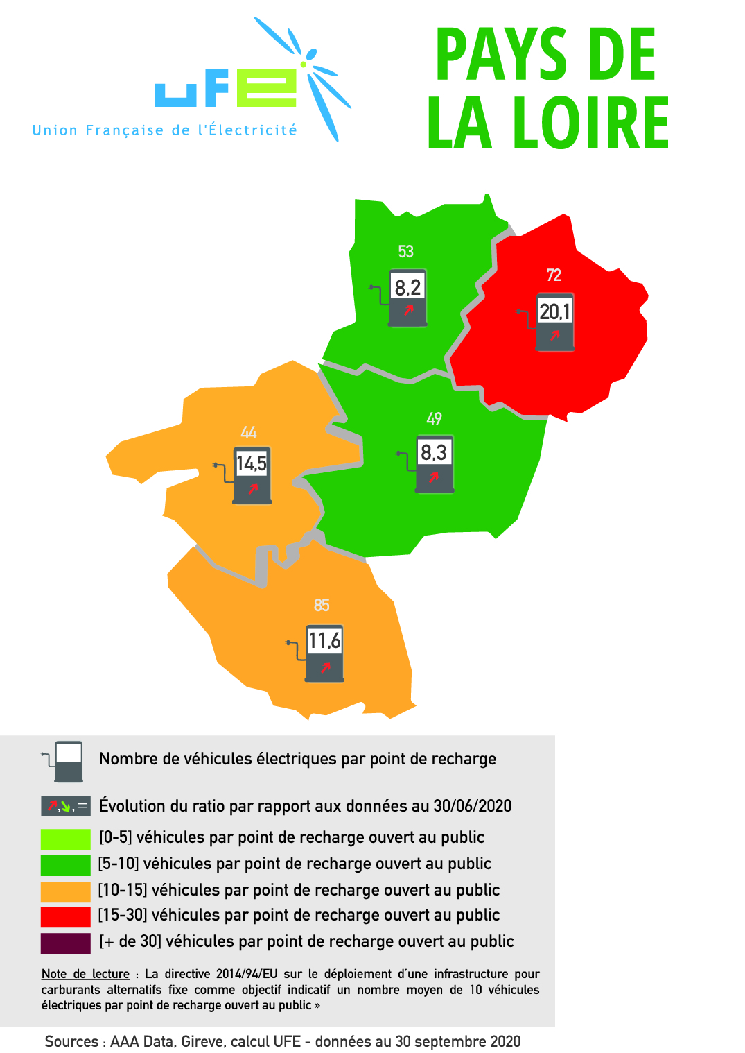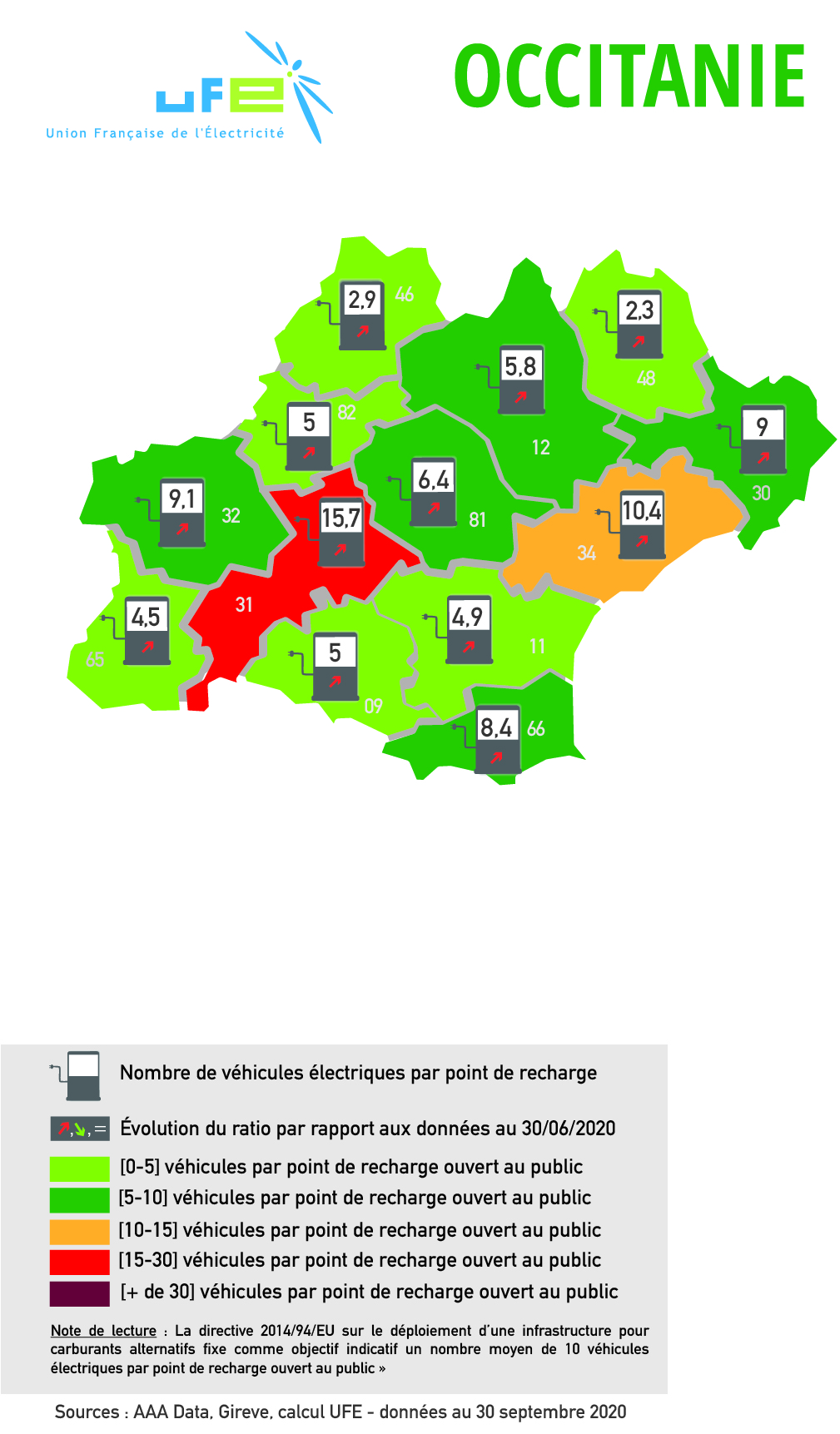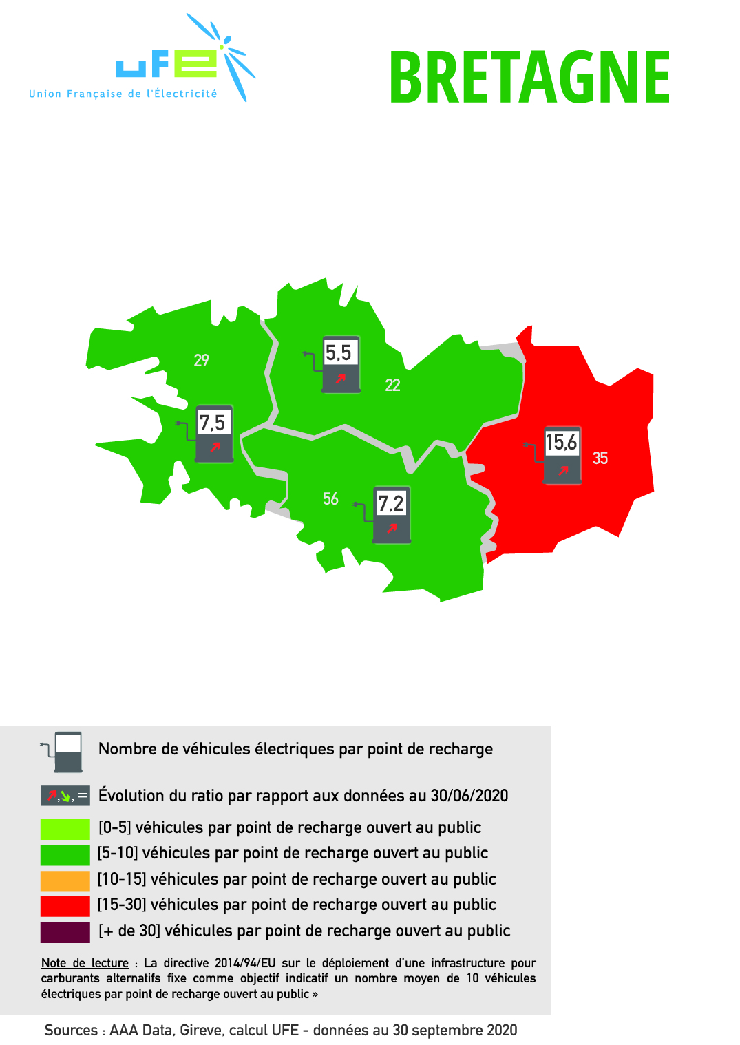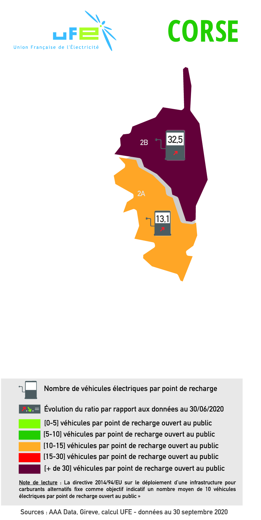 Cette nouvelle édition[[Source : AAA Data et GIREVE pour l’UFE au 30 septembre 2020. Attention, le nombre de points de recharge peut connaitre une baisse significative dans certaines zones géographiques liée à une mise à jour effectuée par GIREVE dans la base de données en octobre dernier.]] présente également l’évolution de ce ratio par rapport à sa valeur de septembre dernier. Si un territoire affiche une flèche rouge vers le haut, le ratio a augmenté ce qui traduit une dégradation de la situation, l’installation de nouveaux points de recharge ayant été moins rapide que le développement de l’électromobilité. A l’inverse, la flèche verte vers le bas montre que le territoire a augmenté son offre en termes d’IRVE ou que les ventes de véhicules électriques n’ont pas connu un rythme de développement équivalent durant cette période.