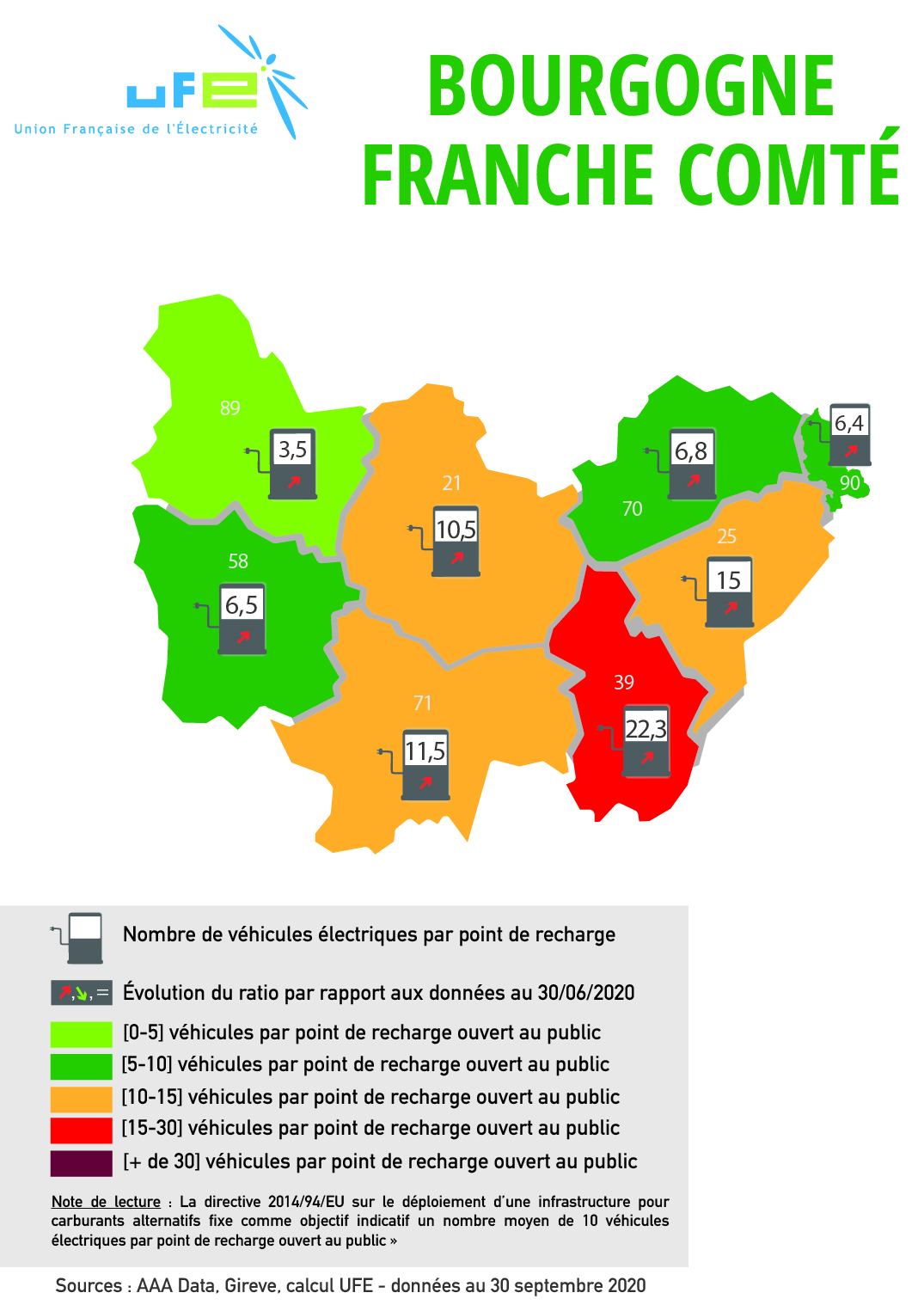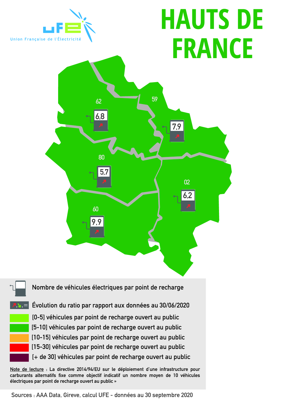 Même si les déterminants de cette répartition peuvent varier d’un territoire à l’autre, le chiffre affiché par territoire traduit le niveau de saturation des IRVE accessibles au public, au regard du parc de véhicules électriques immatriculés dans un département ou une région. Avec ces cartes, il est donc possible de visualiser si un territoire respecte le ratio de 1 pour 10[[La directive sur le déploiement d’une infrastructure pour carburants alternatif 2014/94/EU a défini un ratio optimal de 1 point de recharge pour 10 véhicules électriques pour déployer le nombre suffisant de points de recharge des véhicules électriques dans l’Union Européenne.]] utilisé comme référence pour la détermination de l’objectif de « 100 000 bornes » pour la fin de l’année 2021 et mis en avant dans le plan de soutien à la filière automobile le 26 mai dernier.