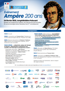Ampère 200 ans entre en 2022 dans sa dernière phase de commémoration. Après différents événements organisés durant l’année 2021, Ampère 200 ans organise un événement présidé par Frédérique Vidal, Ministre de l’enseignement supérieur, de la recherche et de l’innovation, le jeudi 24 février à 16h (au ministère de l’Enseignement Supérieur, de la Recherche et de l’Innovation, 25 rue de la Montagne Sainte-Geneviève, Paris 5e)