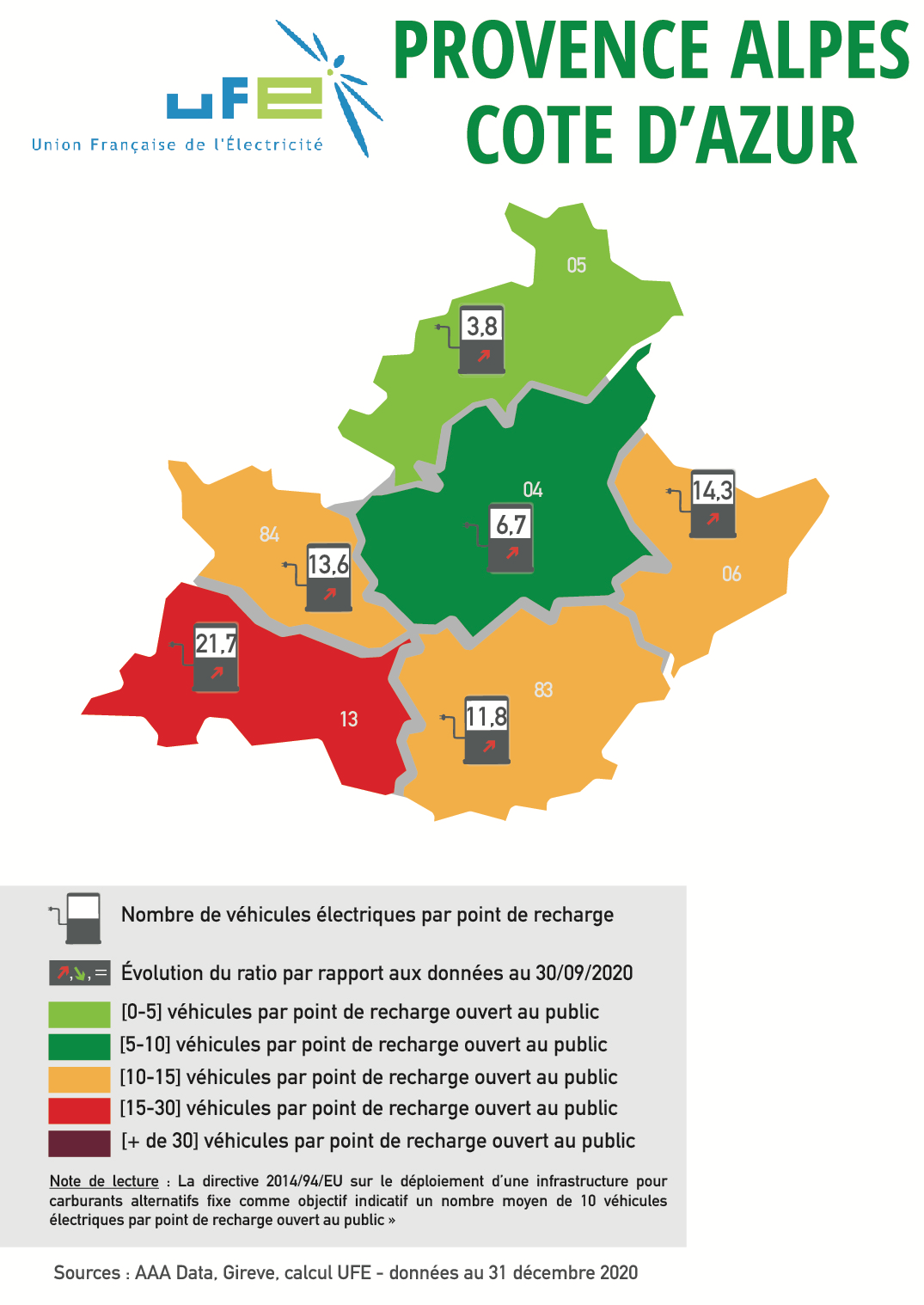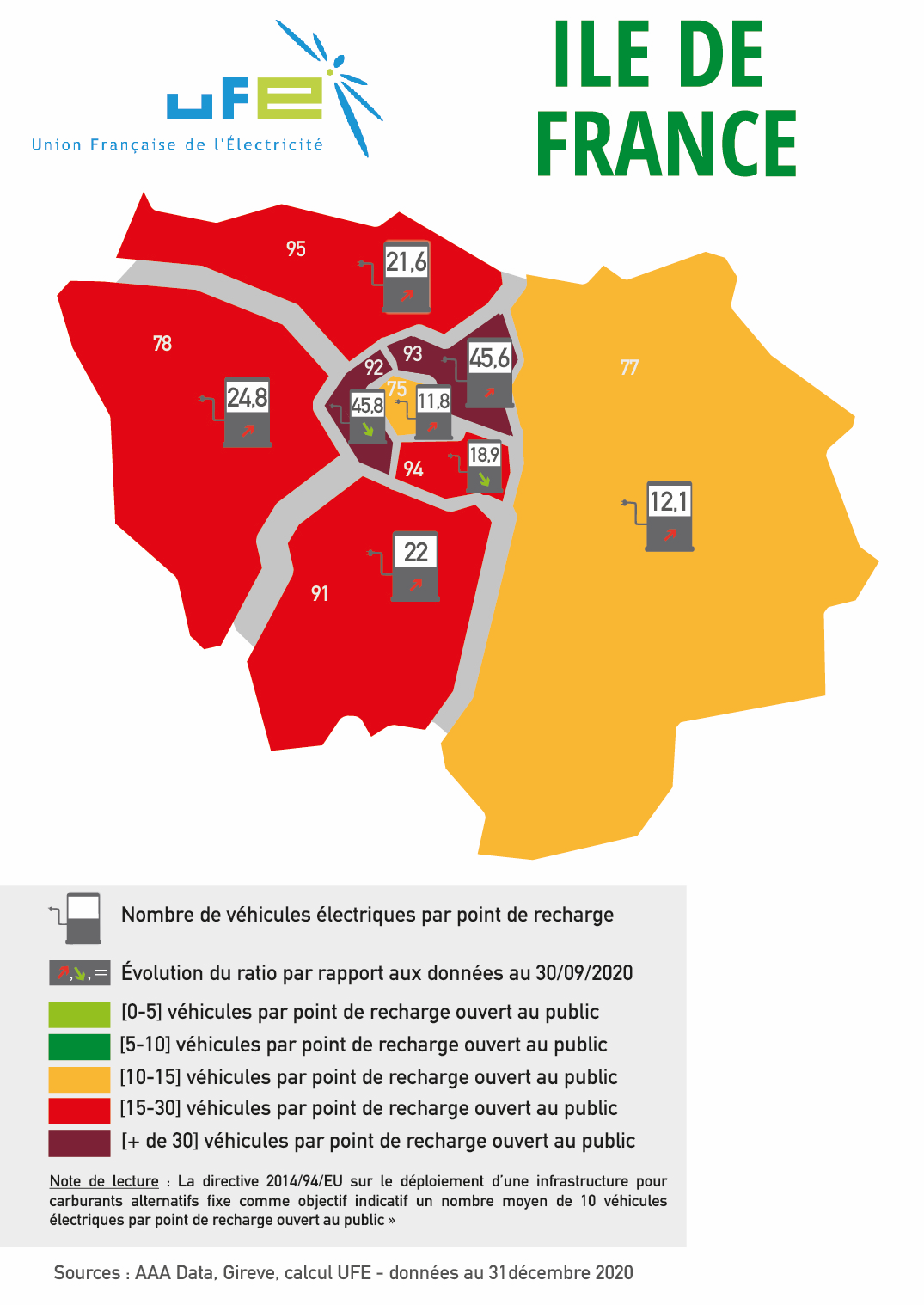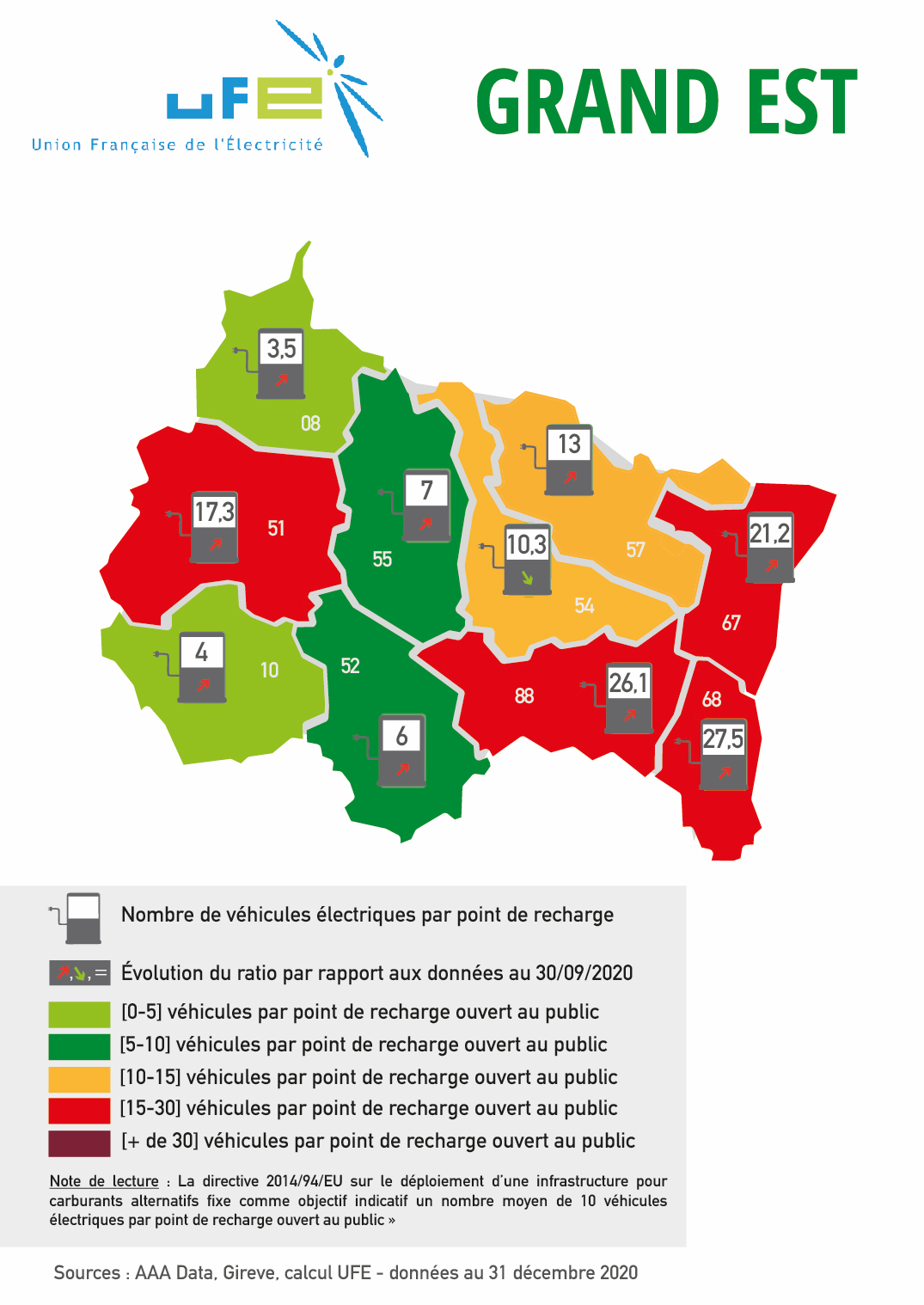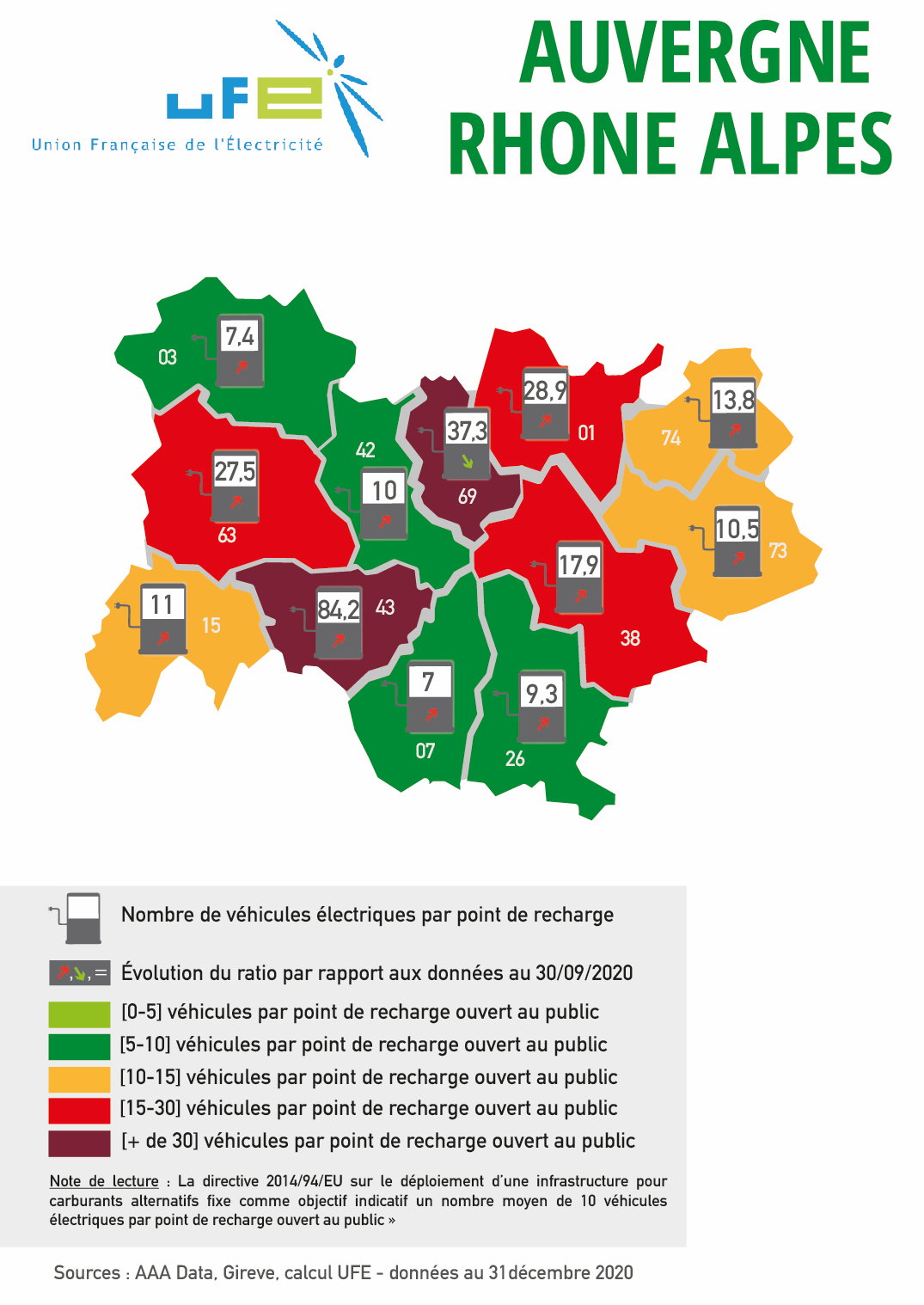 Ces cartes présentées par l’UFE ont vocation à apprécier le dimensionnement des réseaux de points de recharge accessibles au public au regard du nombre de véhicules électriques et hybrides rechargeables présents dans le parc automobile d’un territoire ou d’une région, en se référant au ratio 1 point de recharge pour 10 véhicules électrifiés en circulation issu de la directive 2014/94/UE et repris dans le Contrat Stratégique de la filière automobile signé en mai 2018. Les couleurs permettent ainsi d’apprécier le positionnement du territoire considéré par rapport à cette valeur de « 1 pour 10 ». Les flèches représentent l’évolution de ce ratio par rapport aux données de septembre 2020. Si le ratio a baissé, et donc si la situation s’est améliorée, cela est représenté par une flèche verte vers le bas. A l’inverse, si la situation s’est dégradée, le ratio a donc augmenté, et une flèche rouge et vers le haut sera représentée.