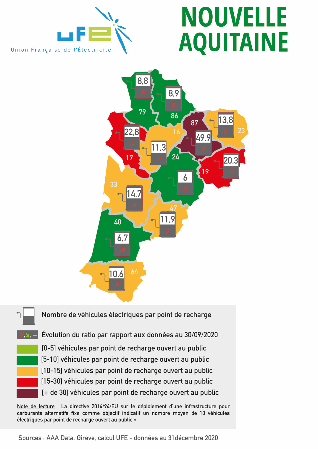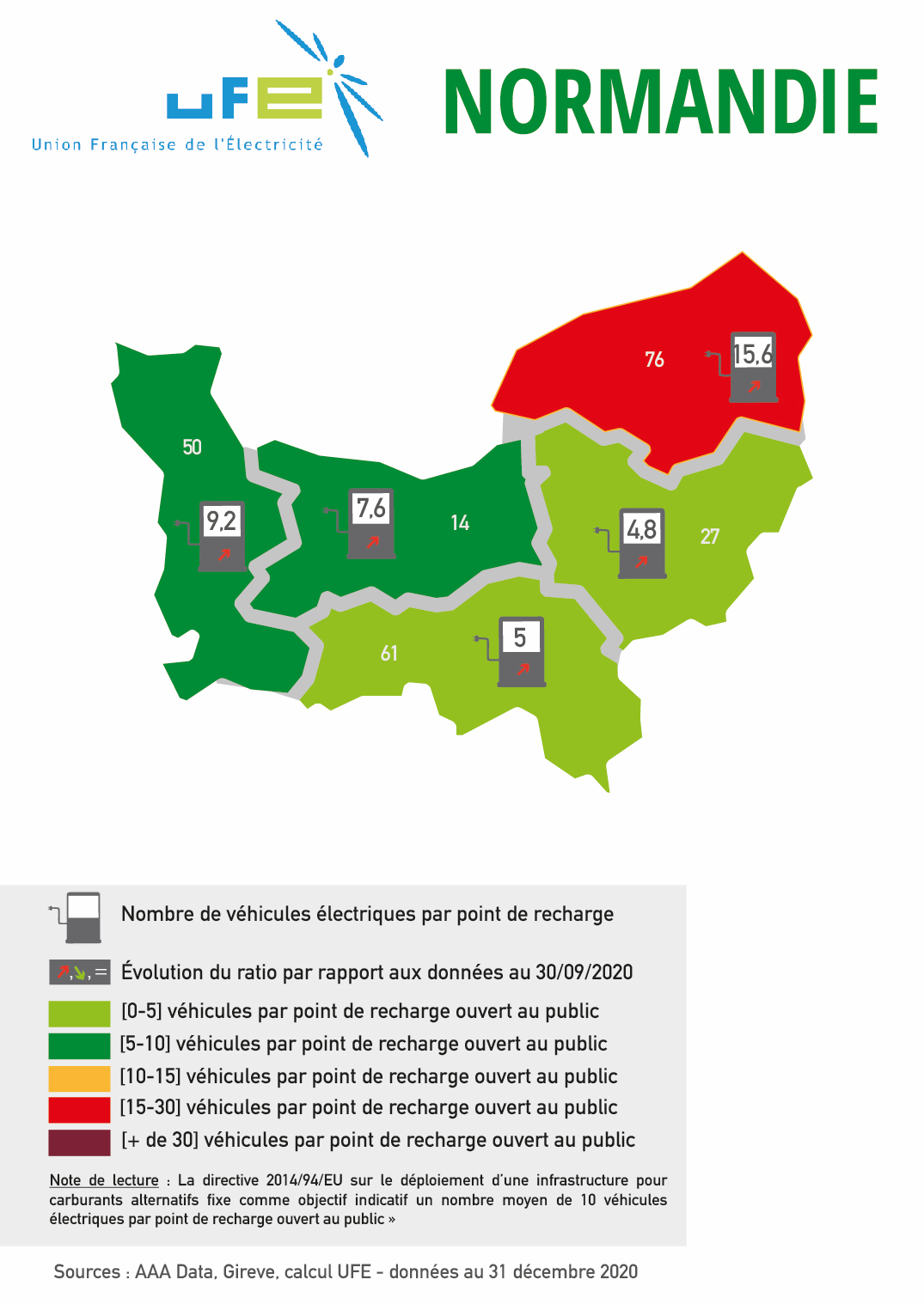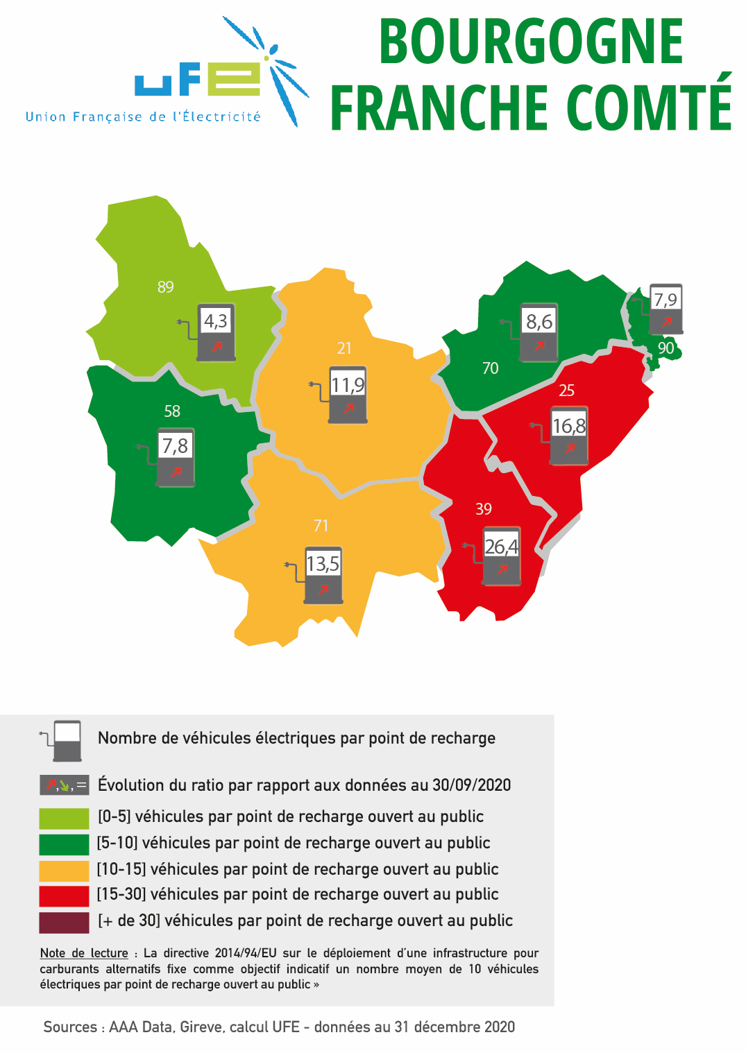 Ces cartes présentées par l’UFE ont vocation à apprécier le dimensionnement des réseaux de points de recharge accessibles au public au regard du nombre de véhicules électriques et hybrides rechargeables présents dans le parc automobile d’un territoire ou d’une région, en se référant au ratio 1 point de recharge pour 10 véhicules électrifiés en circulation issu de la directive 2014/94/UE et repris dans le Contrat Stratégique de la filière automobile signé en mai 2018. Les couleurs permettent ainsi d’apprécier le positionnement du territoire considéré par rapport à cette valeur de « 1 pour 10 ». Les flèches représentent l’évolution de ce ratio par rapport aux données de septembre 2020. Si le ratio a baissé, et donc si la situation s’est améliorée, cela est représenté par une flèche verte vers le bas. A l’inverse, si la situation s’est dégradée, le ratio a donc augmenté, et une flèche rouge et vers le haut sera représentée.
