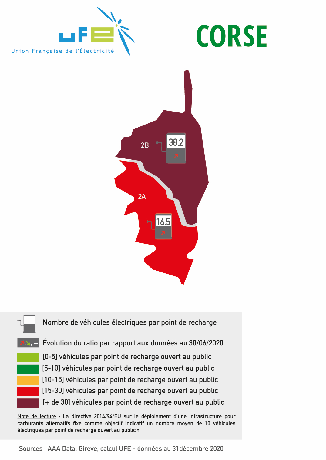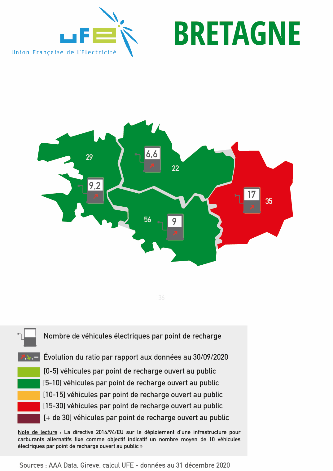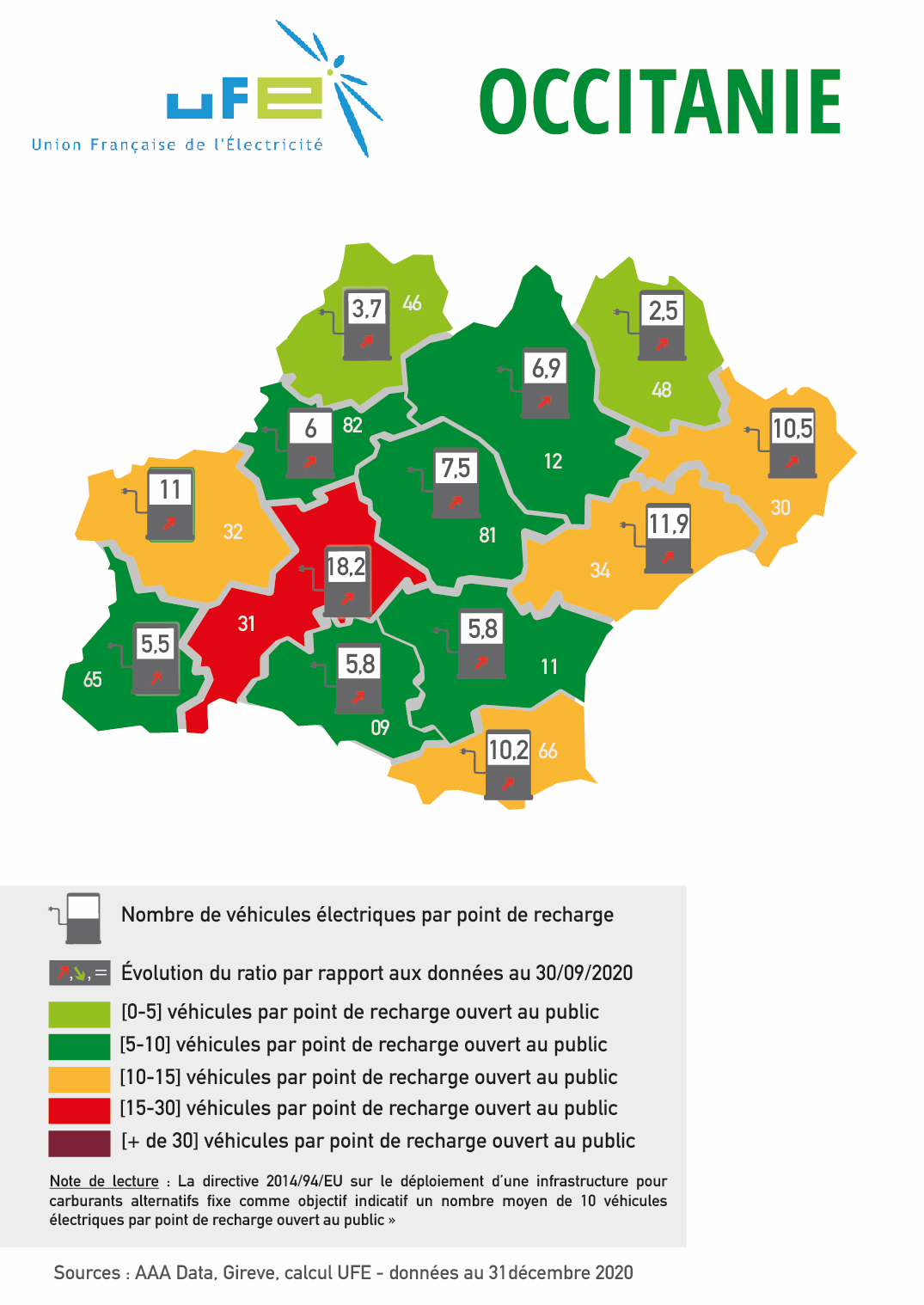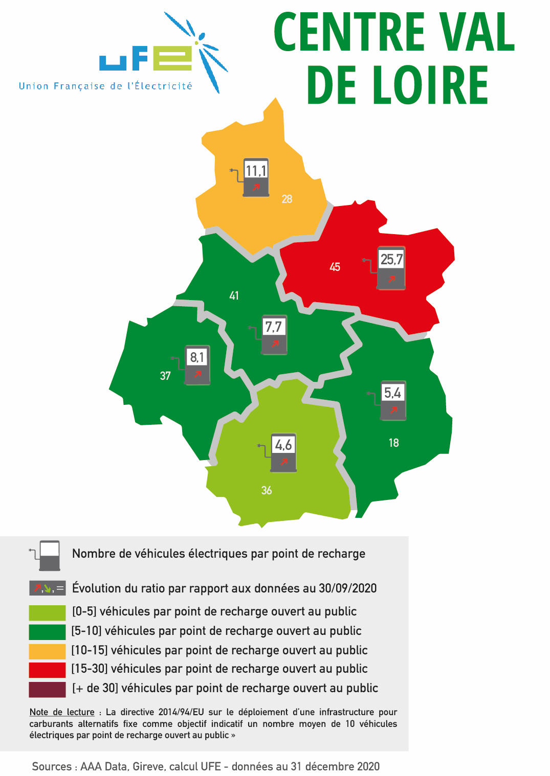 Ces cartes présentées par l’UFE ont vocation à apprécier le dimensionnement des réseaux de points de recharge accessibles au public au regard du nombre de véhicules électriques et hybrides rechargeables présents dans le parc automobile d’un territoire ou d’une région, en se référant au ratio 1 point de recharge pour 10 véhicules électrifiés en circulation issu de la directive 2014/94/UE et repris dans le Contrat Stratégique de la filière automobile signé en mai 2018. Les couleurs permettent ainsi d’apprécier le positionnement du territoire considéré par rapport à cette valeur de « 1 pour 10 ». Les flèches représentent l’évolution de ce ratio par rapport aux données de septembre 2020. Si le ratio a baissé, et donc si la situation s’est améliorée, cela est représenté par une flèche verte vers le bas. A l’inverse, si la situation s’est dégradée, le ratio a donc augmenté, et une flèche rouge et vers le haut sera représentée.